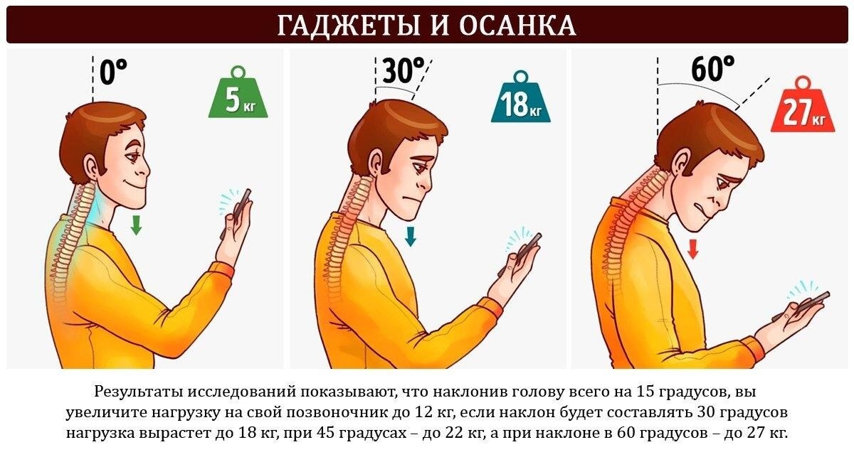 Когда вы сидите за компьютером, читаете или смотрите в экран смартфона, ваша голова наклонена вперед, а шея при этом испытывает гигантский перегруз. Только представьте: голова человека весит примерно 5 кг, именно такой вес держит шея при правильном положении. Если наклонить голову вперёд всего на 15°, то нагрузка на позвоночник возрастёт до 12 кг, а при наклоне в 60° – до 27 кг! Следи за своей осанкой и твой организм будет тебе благодарен!