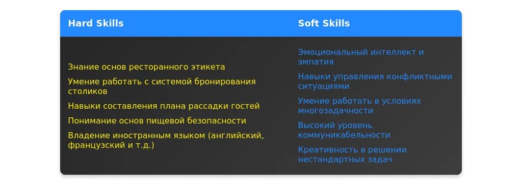 После адаптации: "Знание POS-систем, опыт работы в ресторанах премиум-класса."