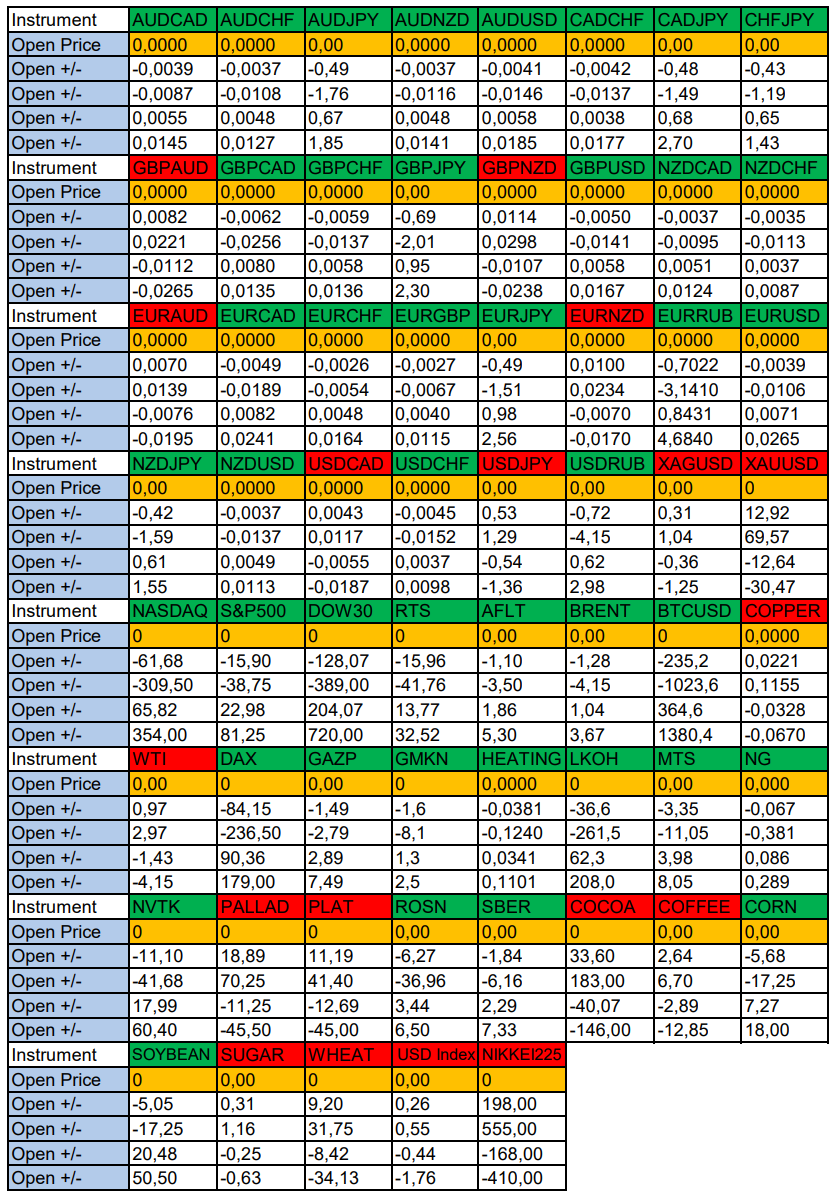 Весь перечень анализируемых активов указан ниже в общем количестве 61 инструмента. Здесь Вы найдете активы рынка Форекс, популярные активы Московской биржи, не менее популярные активы Чикагской биржи СМЕ и мажор криптовалютного сегмента - Биткоин, за которым следуют все альткоины.