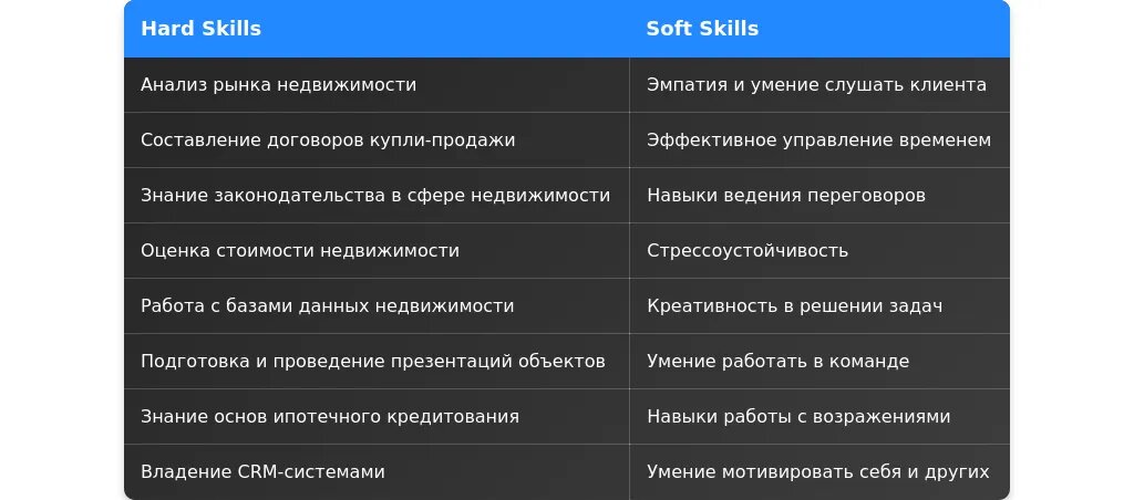После адаптации: "Владение CRM-системами (Bitrix24, Salesforce), знание законодательства в сфере недвижимости, опыт ведения переговоров."