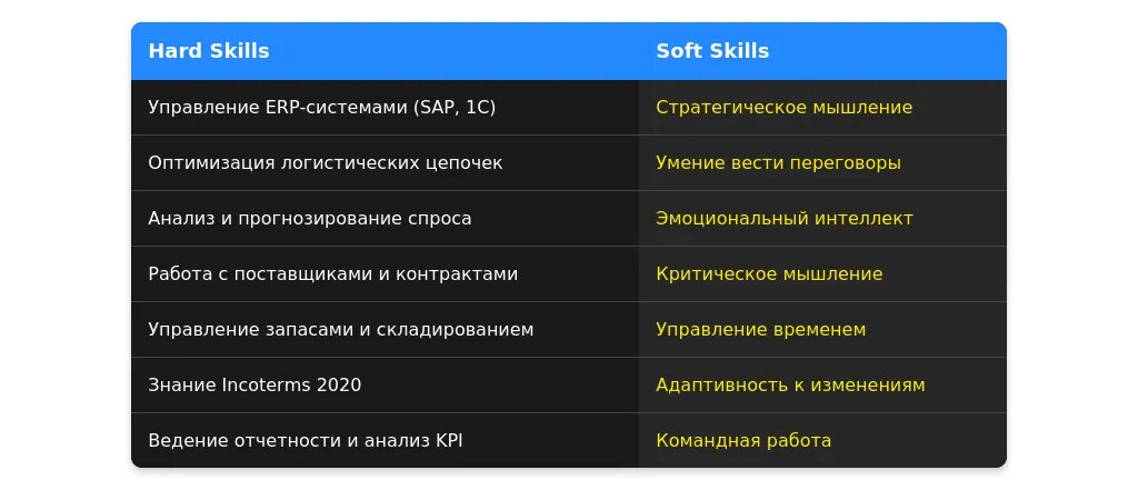 Навыки должны быть перегруппированы в соответствии с требованиями вакансии. Выделяйте ключевые компетенции, такие как "работа с ERP-системами", "управление запасами" и "ведение переговоров". Используйте ключевые слова из описания вакансии для повышения релевантности.