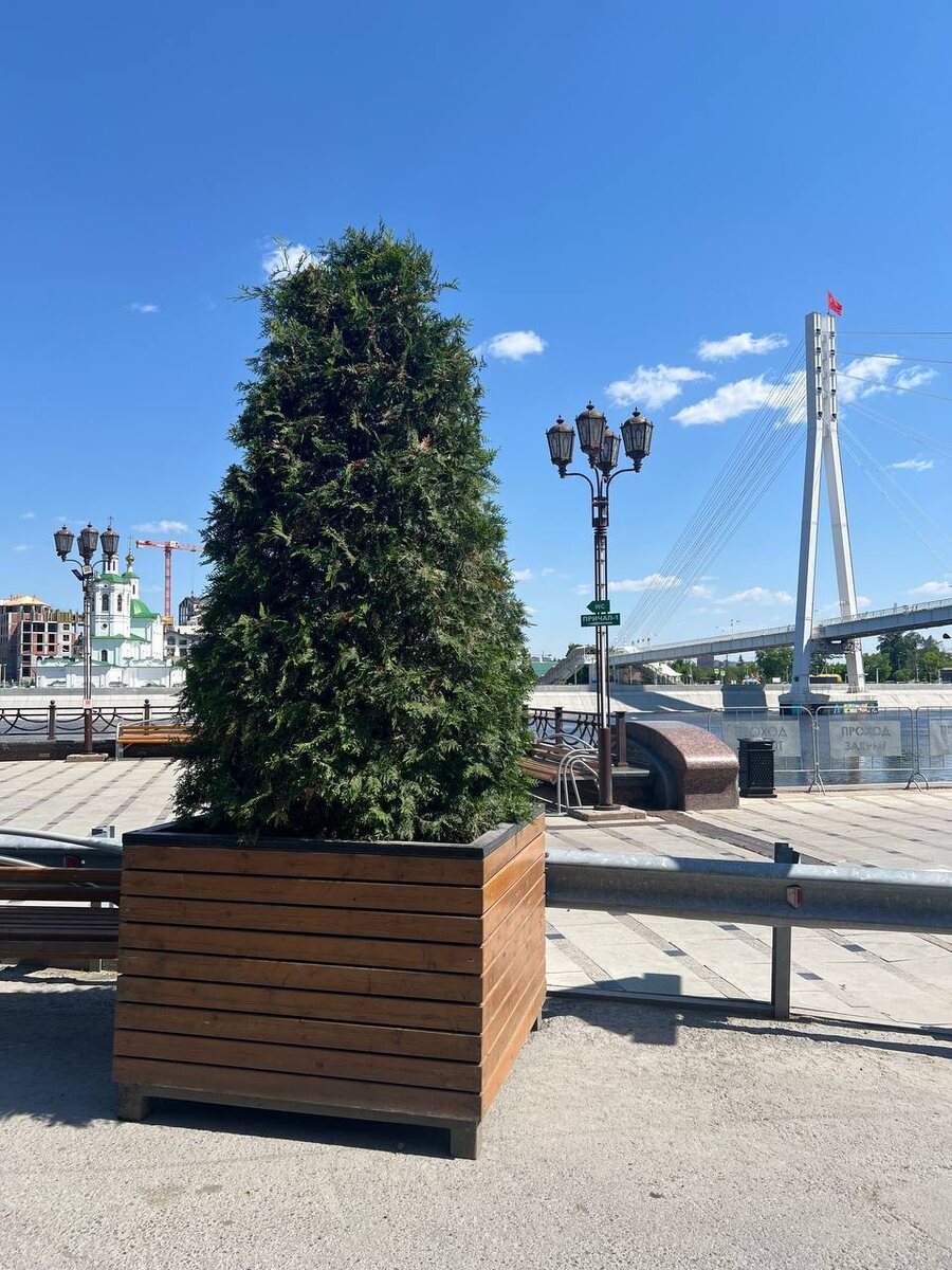 Специалисты Тюменьгормоста разместили хвойные деревья в кадках в районе моста Влюбленных. На зиму туи переезжают в питомник, а весной вновь украшают набережную.