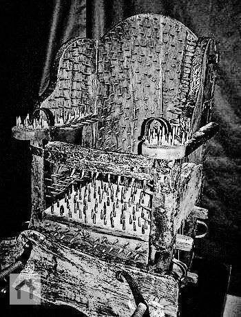 "Стул ведьмы" Пыточный стул, оснащённый шипами и наручниками, с блоками для фиксации положения жертвы и с железным сиденьем, который в ряде случаев раскалялся огнём. Этот распространенный инструмент пыток особенно широко использовался австрийской инквизицией.