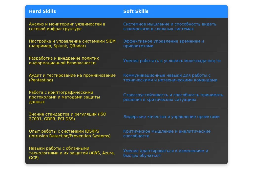 - Технические навыки: SIEM-системы, анализ угроз, криптография.