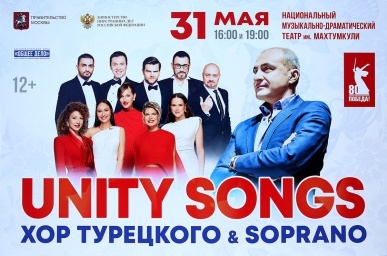 Единение артистов и зала было полным. В Национальном музыкально-драматическом театре имени Махтумкули состоялся концерт Хора Турецкого и группы «Сопрано», организованный по инициативе Посольства России в Туркменистане, а также МИД и Министерства культуры Туркменистана. Хор Турецкого (мужской хор) и группа Sопрано (женский хор) — это известные российские музыкальные коллективы, которые часто выступают вместе. Совместные выступления объединяют силу мужских голосов и красоту женских сопрано, создавая уникальные и яркие концертные программы. Концерт открылся легендарной «Катюшей», а затем прозвучали другие известные песни о войне, Победе и мире, включая «Три танкиста», «Казаки», «Смуглянка», «Тёмная ночь», «Журавли» и «Синий платочек». Особое место в программе заняли песни о Туркменистане, в частности, песня «Ашхабад» на стихи Героя-Аркадага Гурбангулы Бердымухамедова, а также зажигательная «Каракумы» и лирическая «Бибиджан». Одним из трогательных моментов стало совместное исполнение песни