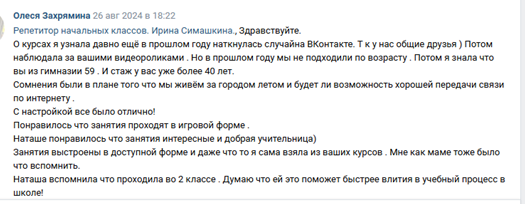 Дарю 2500 рублей, т.е.скидку 50% за весь августовский курс по повторению русского языка и математики с условием оплаты до 1 июля. Такой подарок получат ПЕРВЫЕ ДЕСЯТЬ оплативших. Пишите в комментариях +, вышлю подробности. Кому нужны курсы по повторению? · Тому, кто хочет твердую базу знаний к началу учебного года и улучшение успеваемости. · Тому, кто хочет дать преимущество своему ребенку в успешном старте нового учебного года сразу с 1 сентября. Кому не нужны курсы по повторению? · Конечно, тому, у кого есть свободное время и терпение, чтобы вспомнить все забытое ребенком за лето. · Или тому, чей ребенок настолько смотивирован, что самостоятельно качественно все повторит без вашего вмешательства. Отзывы о курсах по повторению с прошлого года