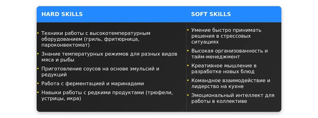 Навыки нужно перегруппировать так, чтобы наиболее важные для вакансии компетенции были на первом месте. Например, если вакансия требует знание азиатской кухни, этот навык должен быть выделен. Также важно использовать ключевые слова из описания вакансии.