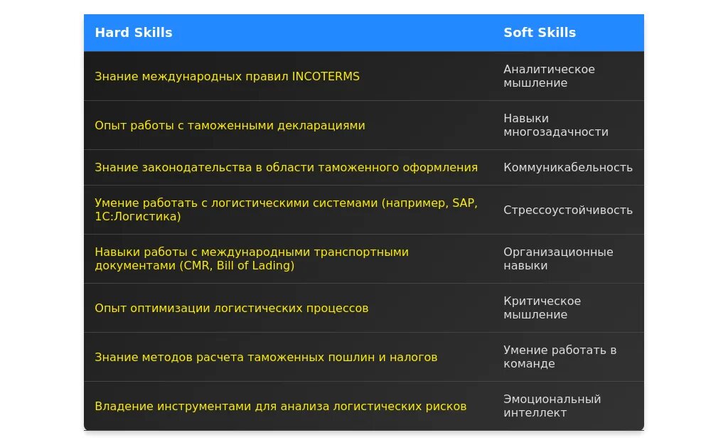 При анализе вакансии важно выделить ключевые требования, которые работодатель указывает в описании. Обратите внимание на обязательные требования, такие как знание таможенного законодательства, опыт работы с логистическими системами и владение специализированным ПО. Желательные требования могут включать знание иностранных языков или опыт работы в международных компаниях. "Скрытые" требования часто проявляются в формулировках, таких как "умение работать в условиях многозадачности" или "высокая стрессоустойчивость".