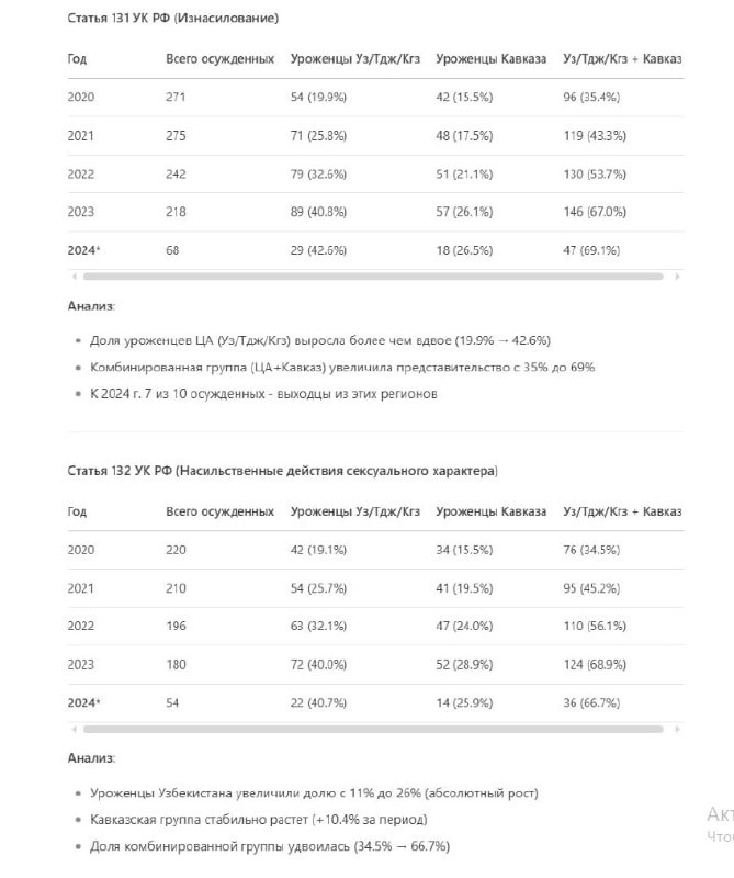 ⏺Добрые русские люди прогнали через нейросеть все уголовные дела по Москве с 2020 по 2024 год и выяснила, что 80% всех преступлений были совершены таджиками, узбеками, киргизами и кавказцами. При этом их общая численность от общего числа составляет всего 15-20%, что свидетельствует о сильной расположенности мигрантов, как внешних, так и внутренних, к нарушению закона. Так, например, 100% осужденных по статье об изнасиловании несовершеннолетних оказались уроженцами Киргизии, Таджикистана, Узбекистана и республик Северного Кавказа. Тоже самое по изнасилованиям - 76% преступлений совершается абу-бандитами и мастурбеками. Также нейросеть нашла в официальных отчётах и другую интересную информацию, ранее не мелькавшую в Сети: ▪️67% осужденных из целевых групп имеют ≤9 классов образования (Минпросвещения 2023). ▪️61% взрослых мигрантов не владеют русским на уровне понимания законов (тестирование МГУ). ▪️48% детей-первоклассников из этих семей не понимают учителя (Москомобразование 2022). ▪