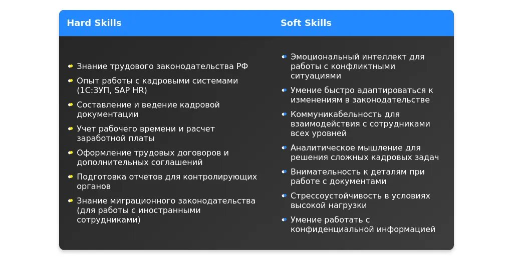 Пример 4: "Знание трудового законодательства, опыт внедрения HR-систем, готовность к командировкам."