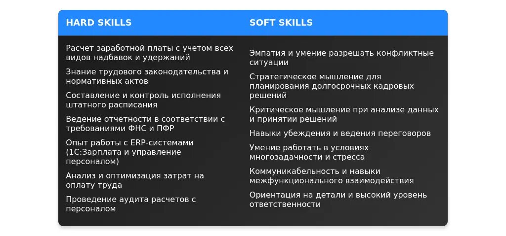 Навыки: все, что связано с зарплатой и кадрами.