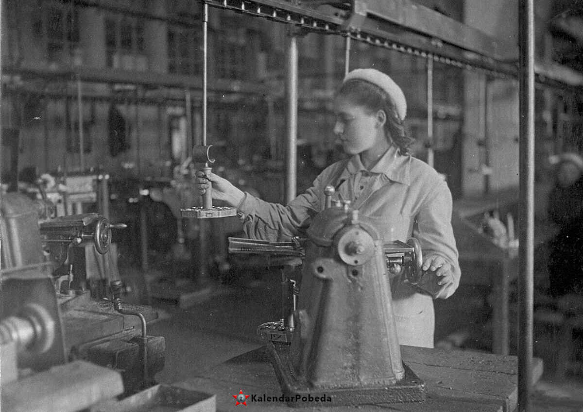 Воспоминания тружеников тыла Ольга Треймут, о работе на заводе: "Впервые там я увидела, как люди спят… стоя. Женщины в санитарной комнате, прислонившись к косяку, стенам, изнеможденные от бессонной смены, выходили сомкнуть глаза на пять минут. Уставали ноги, немели руки, перед глазами — вертящаяся фреза, а в голове крутится чудное название супа, которым накормят в столовой, — «шулюм» без мяса, с крапивой и зелеными помидорами. Самый вкусный на свете…" Календарь Победы