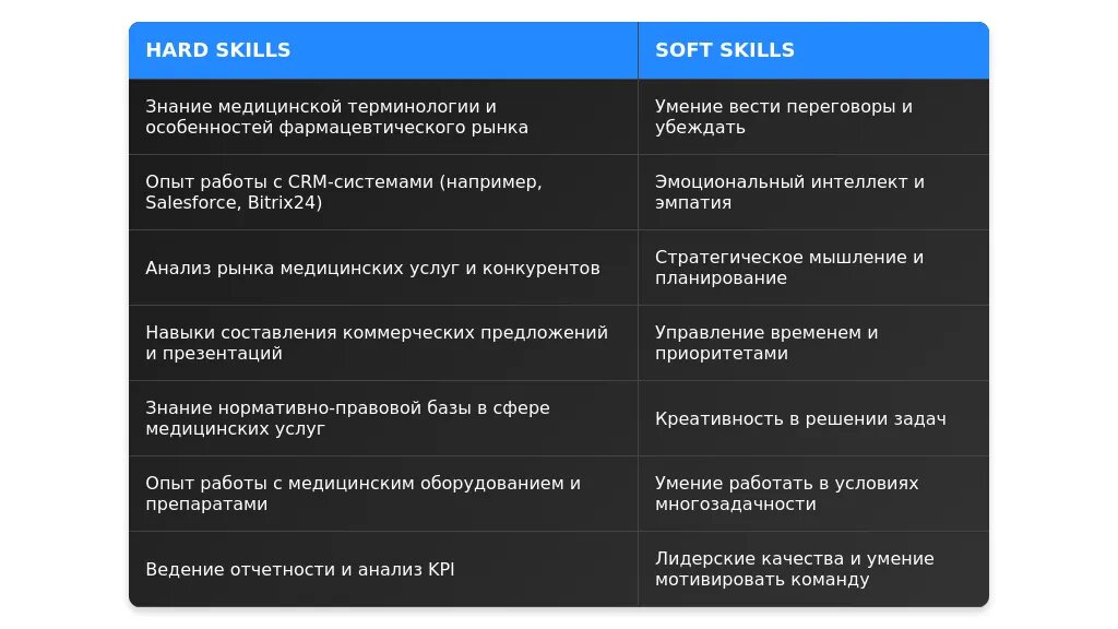 После адаптации: "Навыки продаж медицинских услуг, ведение переговоров, заключение договоров, работа с CRM-системами."
