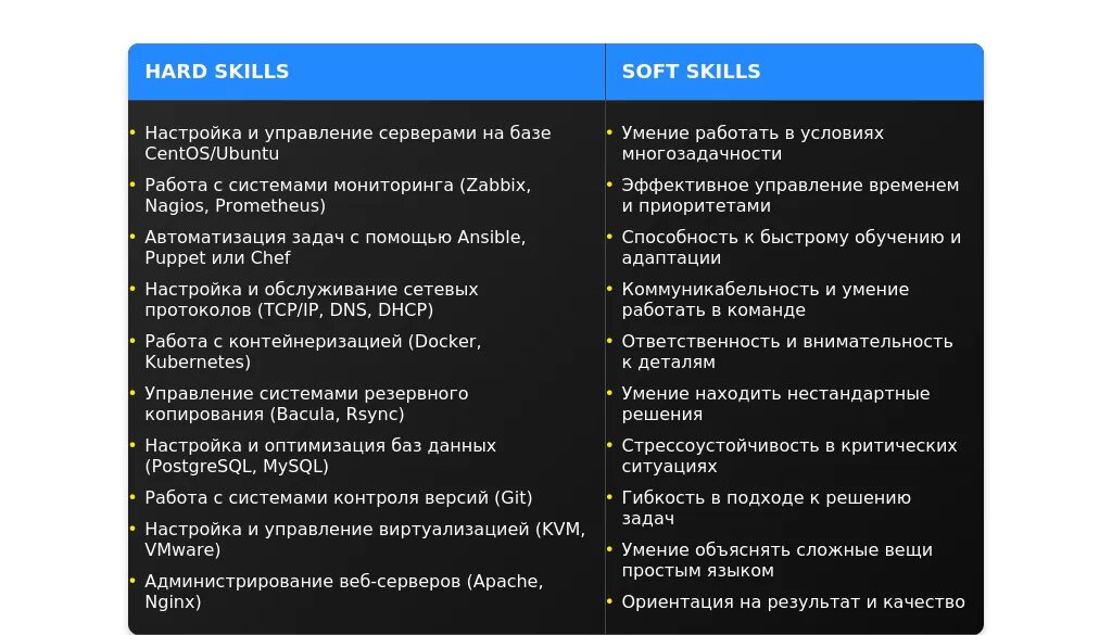 После адаптации: "Настройка сетей (TCP/IP, DNS, DHCP), мониторинг (Zabbix, Nagios), базы данных (PostgreSQL, MySQL)."