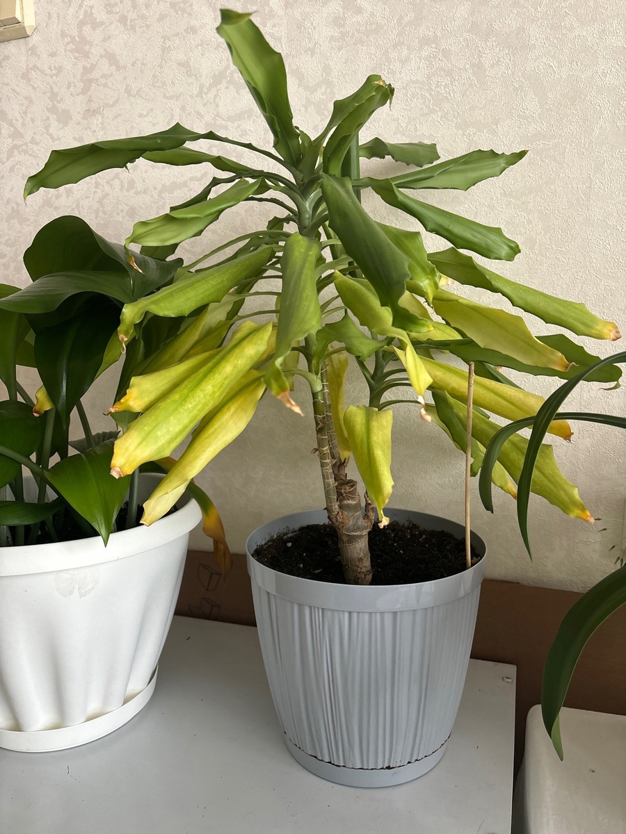 Здравствуйте. Подруга в связи с отъездом отдала драцену. Не знаю что с ней делать и как помочь. Листья все скручены. Нижние листья желтые и на кончиках засушены. Грунт рыхлый и влажный.Растет в 3 ствола. Если нужна пересадка, подскажите какой грунт ей нужен. И какой полив. Вредителей нет.