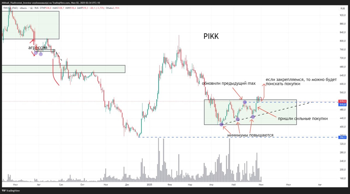 Выросли на новостях о стимулировании ипотечного кредитования. Обновили предыдущий максимум 515. Минимумы повышаются. Если закрепляемся, то можно будет поискать покупки.