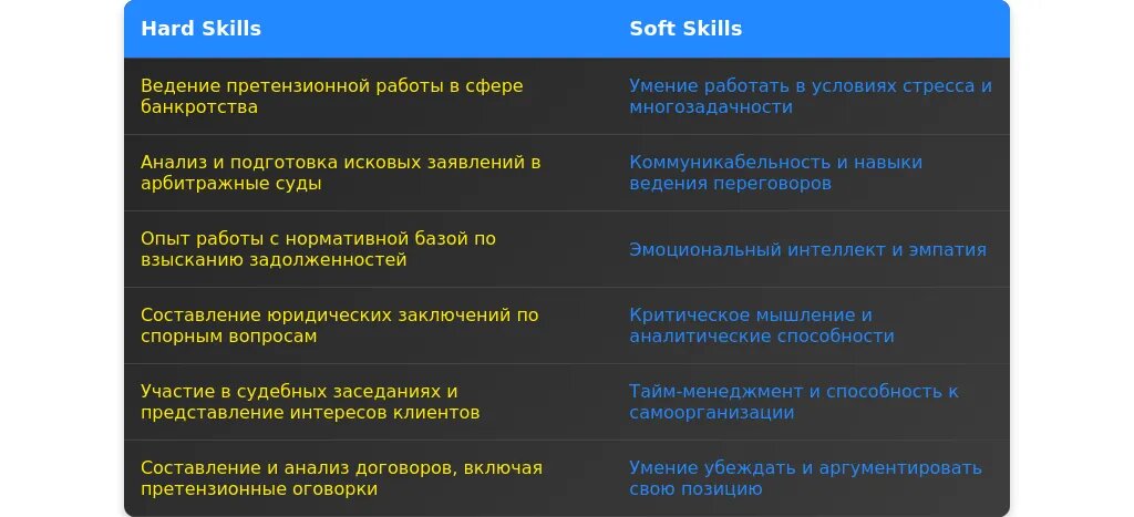 Навыки должны быть перегруппированы под требования вакансии. Выделите ключевые компетенции, такие как знание законодательства, опыт ведения переговоров или составления процессуальных документов.