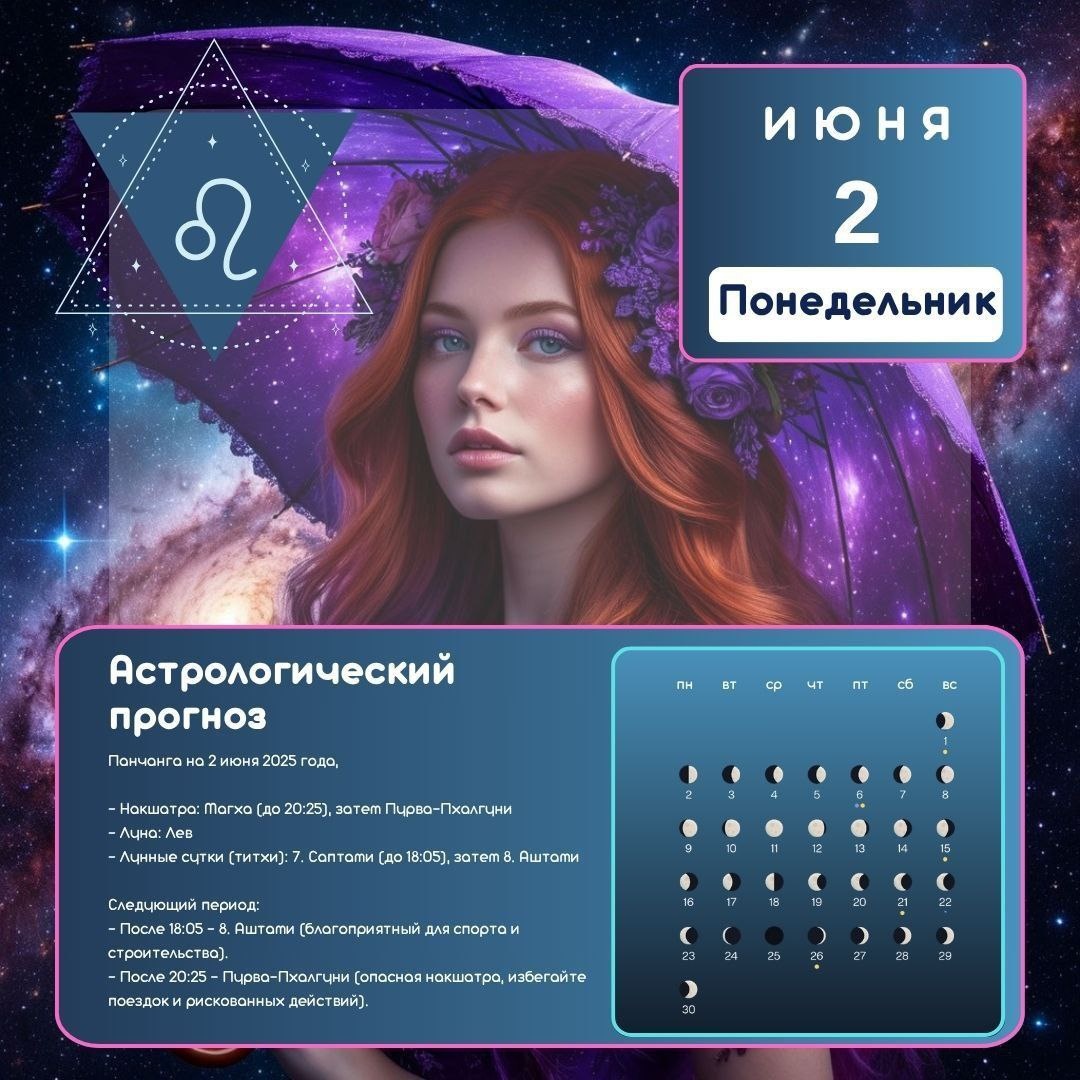 🦝Понедельник, день Луны (Луна во Льве) – это как королевский спектакль на звездной сцене! Главная Тема Дня – это эмоции, жаждущие признания, творчества и ярких впечатлений. Мы все немного актеры на этой сцене. Желание быть замеченным, оцененным, проявить щедрость души и творческую искру будет особенно сильно. Но помни – Лев любит аплодисменты, так что не стесняйся хвалить других! 🌸Ключевые Вехи Дня: 1️⃣. До 18:05 - 7е Лунные сутки, Ваниджа карана Энергия: 〰️День "Торговца" или "Обменника". Хорошо для деловых переговоров, заключения взаимовыгодных сделок, налаживания связей, "продажи" своих идей или талантов. Общение – ваш инструмент! Используйте харизму Льва, чтобы очаровать собеседников. 〰️Фокус: Ищите баланс между "даю" и "беру". Как вы можете обменяться ресурсами (знаниями, энергией, поддержкой) к обоюдной выгоде? 2️⃣. После 18:05 - 8е Лунные сутки (Вишти Карана): 🌙Энергия: Наступает время "Препятствий" или "Пустоты". Общая энергия может пойти на спад. Особенно осторожным бу