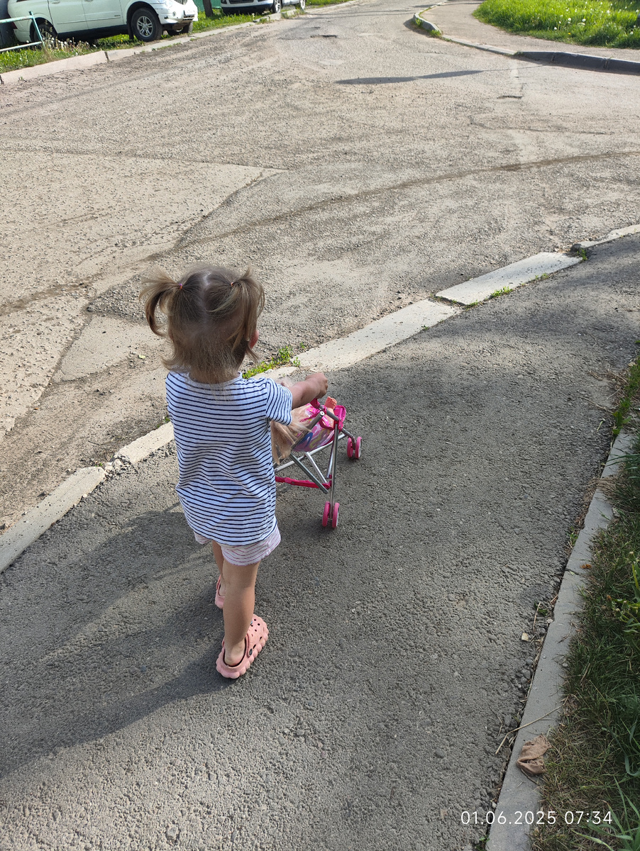 Купили Аринке коляску для кукол. Сначала пластиковую, а она развалилась на второй день. Да и маленькая оказалась для любимой куклы. Я её скотчем полечила, но пластик срастать отказался... Купили металлическую. Тяжеловата. Аринке то нормально. Если ей надо, она и танк утащит😂. А вот мне, когда я везу коляску, продукты и Арину с коляской и куклой на стройку... Таскаем её теперь туда-сюда... Утром 1 июня пошли с этой коляской в магазин. Как в сказке, лягушонка в коробчонке едет. Коляска дребезжит, Аринка визжит от восторга, пугает прохожих и кошек. Время 7:30😂 А счастья-то сколько! Сама... "Сяма"