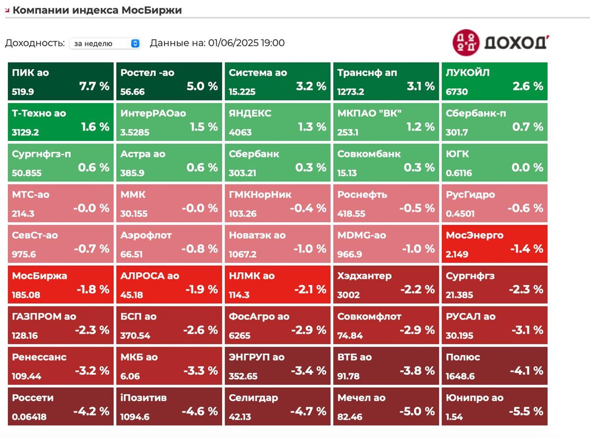 РФ рынок: что нас ждет сегодня В пятницу индекс мосбиржи вырос на 1,4% до 2830 пунктов. На выходных после новостей мы увидели панику и упали на 3% до 2750 пунктов. Сейчас торгуемся чуть повыше. Юань вырос на 0,4% до 10,9 Нефть упала на 1% до $62,7. Однако, сегодня утром торгуется в +2,5% - на факте выносят шортистов. ОПЕК+ увеличат добычу в июле на 400 тысяч баррелей. Теракты: Украина взорвала два моста в Брянской области и один в Курской. Погибло 7 человек и пострадало 40. Это, конечно, негатив для мирного трека - но пока стараются не раздувать. Также атаковали аэродромы стратегической авиации в РФ с помощью атаки дронами с территории РФ. Операция действительно проведена грамотно - атаковали с фур недалеко от аэродромов. Медийно, конечно, эффект огромный, но в реальности уничтожили 3 самолета и повредили 7. Да неприятно, но некритично. Это все-таки военные объекты и просчет наших военных. Пишут, что американцы про данную атаку не знали. Компании: 1)Роснефть: слабый отчет Выруч