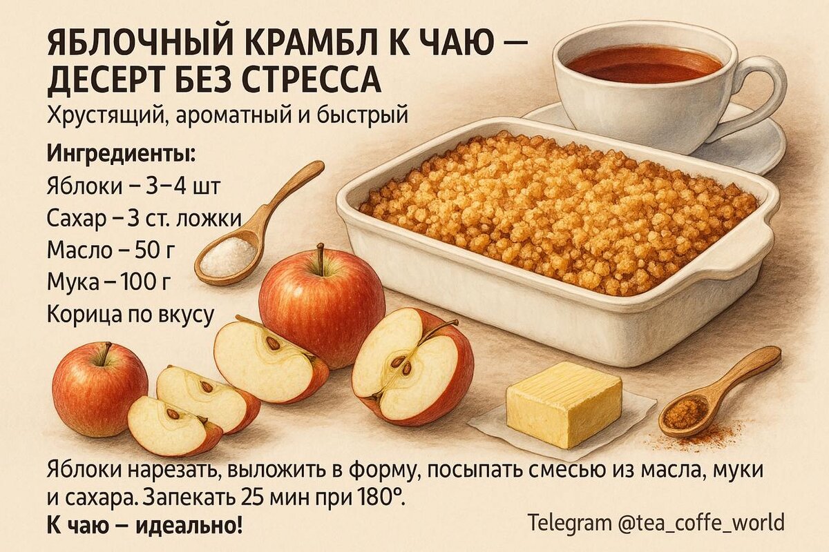 ЯБЛОЧНЫЙ КРАМБЛ К ЧАЮ — ДЕСЕРТ БЕЗ СТРЕССА Хрустящий, ароматный и быстрый — как раз к вечернему чаю. Ингредиенты: Яблоки — 3–4 шт Сахар — 3 ст. ложки Масло — 50 г Мука — 100 г Корица по вкусу Яблоки нарезать, выложить в форму, посыпать смесью из масла, муки и сахара. Запекать 25 мин при 180°. К чаю — идеально! ☕️ЧАЙ ИЛИ КОФЕ? #прочай #десерт #яблочныйкрамбл #рецепт Slug: apple-crumble-tea