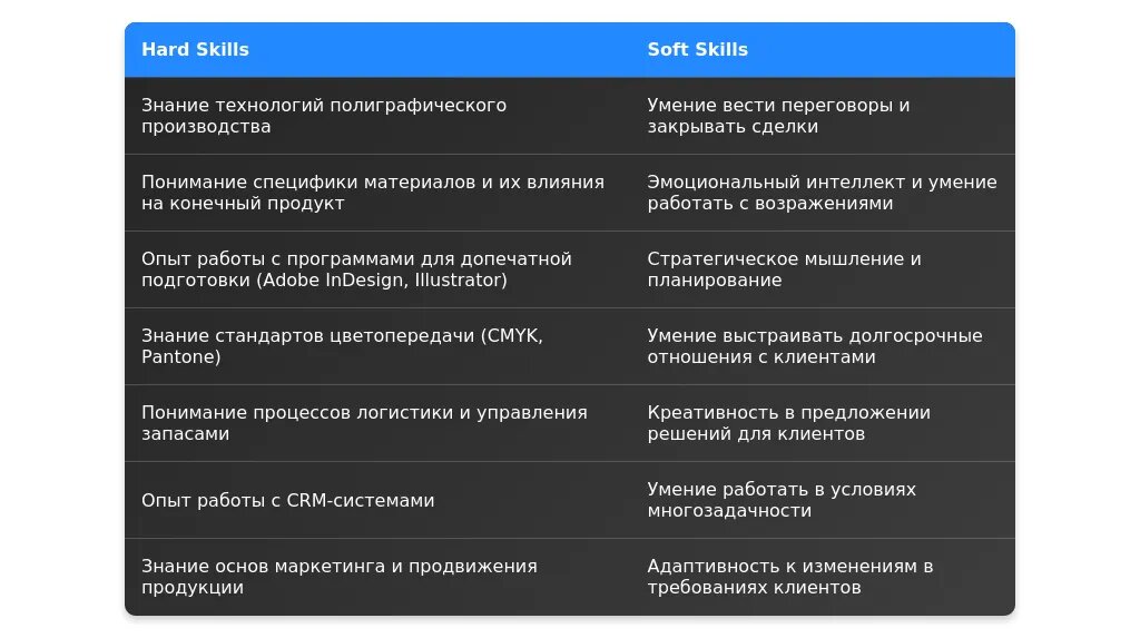 После адаптации: "Опыт работы с CRM-системами (Bitrix24, Salesforce), навыки ведения переговоров с корпоративными клиентами, знание основ полиграфического производства."