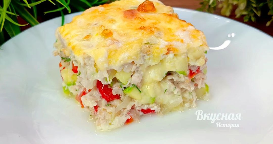 Всем здравствуйте. Готовлю такую запеканку из кабачков с фаршем, все лето. Люблю этот рецепт за его простоту, готовится очень просто, а получается ароматное, сытное, вкусное блюдо.👌😋 Можно добавить сюда и другие овощи на ваш вкус, а также свои любимые специи. Список ингредиентов вы найдете в конце⤵ 500 г кабачков нарезаю кубиками. Все овощи кладу в миску. Примерно 1\2 сладкого перца нарезаю небольшими кусочками. 1 помидор нарезаю кубиками. 1 луковицу. Укроп, небольшой пучок. К овощам добавляю 400 г куриного фарша. Добавляю 1-2 зубчика измельченного чеснока. Солю, перчу по вкусу. Добавляю сладкую паприку. Все хорошо перемешиваю. Кладу в форму для запекания. Форму можно смазать растительным маслом. В отдельную миску разбиваю 4 яйца, добавляю щепотку соли и слегка взбиваю венчиком. Добавляю 100 г сметаны, жирностью 15-20 % жирности. 100 г сыра. Перемешиваю. Поливаю овощи с фаршем заливкой. Прокалываю вилкой, чтобы заливка равномерно распределилась. Выпекаю при температуре 180 градусов