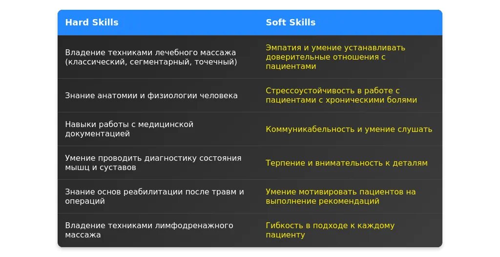 После адаптации: "Владение техниками классического, лечебного и аппаратного массажа. Знание современных методик реабилитации."
