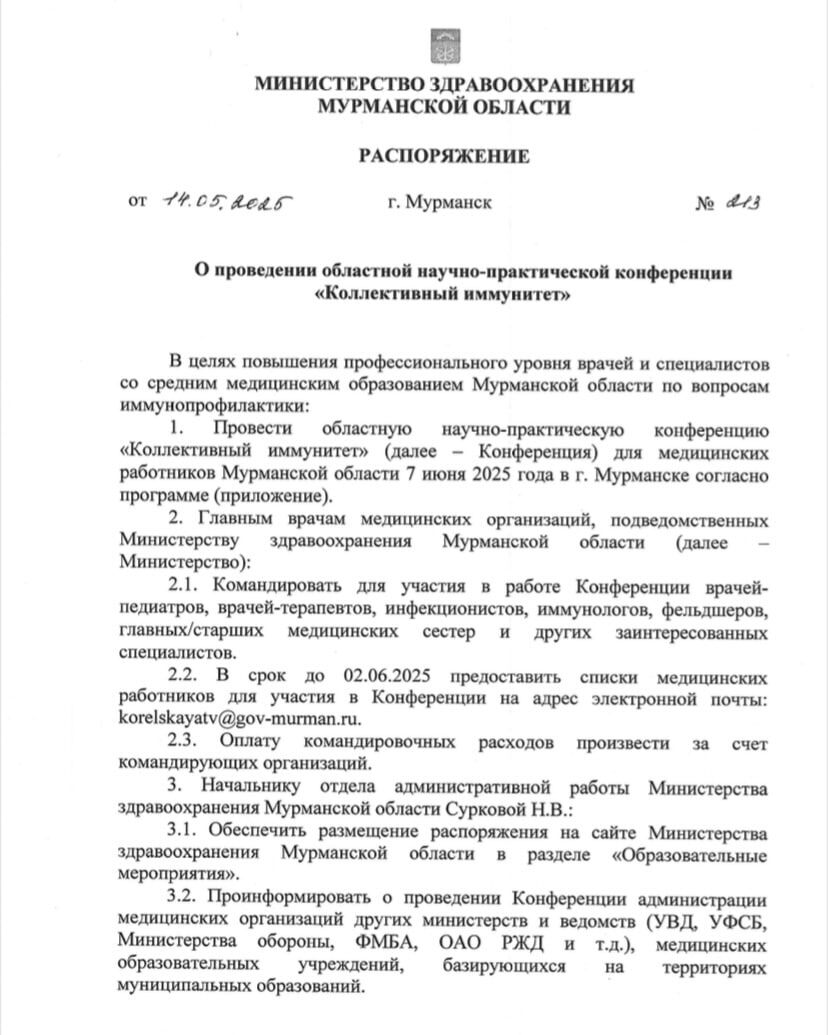 Коллективный иммунитет в Мурманске 🔥 Мы не обманываем, Минздрав Мурманской области даже Распоряжение выпустил об этом! 😲 КАК ТАК ПОЛУЧИЛОСЬ? Оказывается, заместитель министра здравоохранения Мурманской области — наша давняя читательница. Она решила организовать у себя в регионе встречу, посвященную вакцинации, а идея встречи выросла в полноценную областную конференцию 🔥 👩👧👦 ДЛЯ КОГО ЭТО МЕРОПРИЯТИЕ? В первую очередь конференция организована для медработников Мурманской области — педиатров, терапевтов, инфекционистов, иммунологов, фельдшеров, главных и старших медсестер и других заинтересованных специалистов. Но организаторы конференции приглашают всех-всех-всех, кто хочет послушать целых 3 лекции о прививках — вход свободный! Программа по ссылке. 🗣 О ЧЕМ БУДЕМ ГОВОРИТЬ? 1️⃣ «Мифы вакцинации»: лучше переболеть, прививки не нужны, прививки ничего не гарантируют, прививки вызывают аутизм/бесплодие/ДЦП, перед прививкой нужно обследование, беременным и кормящим вакцинироват