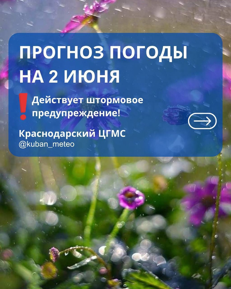 ☁️⛅⛈️ В первый понедельник лета в Краснодарском крае сохранится неустойчивая погода. Ожидаются кратковременные дожди и грозы, местами — сильные дожди, град и шквалистое усиление ветра. Будьте внимательны: при грозах возможны резкие порывы ветра. Утром — туман. Специалисты Краснодарского ЦГМС подготовили прогноз погоды на 2 июня👇🏼 ☀️ В Краснодарском крае — переменная облачность. Местами кратковременные дожди и грозы. В отдельных районах — сильный дождь, ливень в сочетании с грозой, градом и порывами ветра 20–22 м/с (КМЯ). Ночью и утром — местами туман. Ветер северо-западный, западный 4–9 м/с, днём местами порывы 12–14 м/с. Температура воздуха: • ночью +13…+18°, • днём +25…+30°, • в южной половине края местами +18…+23°, • в горах ночью +4…+9°, днём +7…+12°, • на Черноморском побережье ночью +12…+17°, днём +20…+25°. 🏙 Краснодар: переменная облачность. Ночью без существенных осадков, утром и днём — кратковременный дождь, гроза. Ветер северо-западный, западный 4–9 м/с, днём 6–11 м/с.