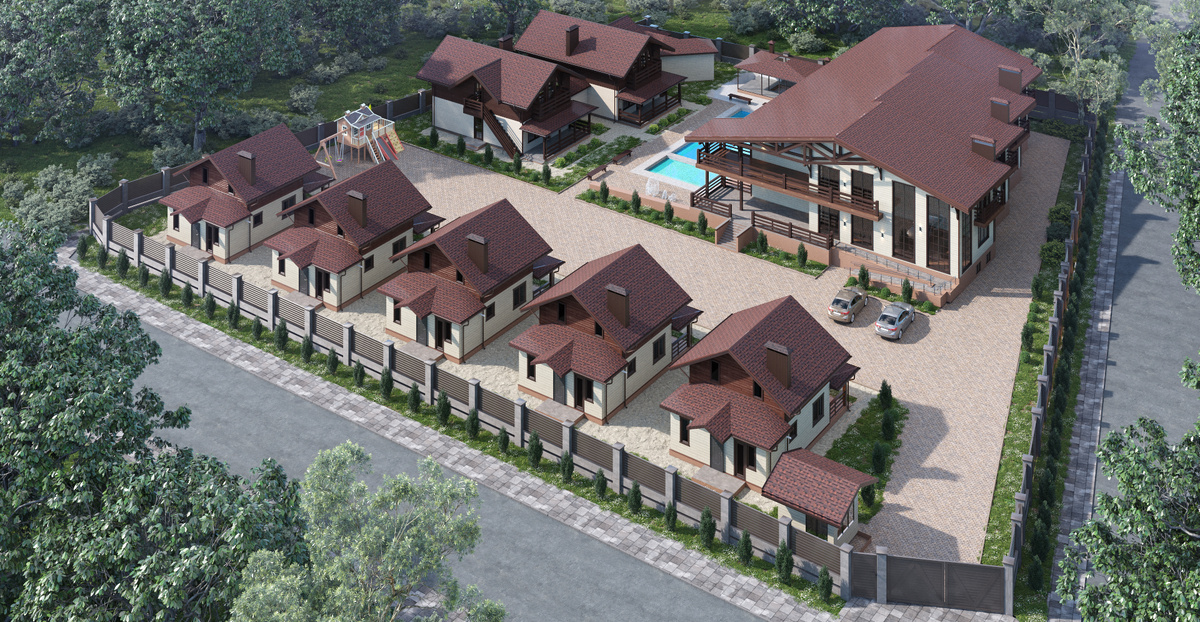 от непогоды, а как пространство, где происходит единение с природой . Гостиничный комплекс включает в себя семь двухэтажных коттеджей и гостевой корпус на 21 номер. Проект выполнен на основе заводского деревянного каркаса от «Центра Каркасных Технологий» с антисейсмическими