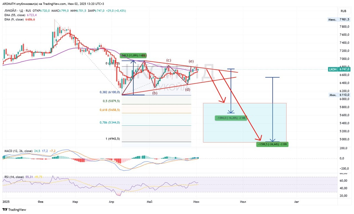 🛢️ Царь рынка #LKOH ЛУКойл торгуется сегодня последний день с дивидендом внутри 541 рубль. И далее, согласно курсу Дивидендное инвестирование АРОМАТ, у нас будет 2 варианта. 1️⃣Первый - это попытка быстрого закрытия дивидендного гэпа прямо сейчас в течение 1-2 недель. В таком случае, основываясь на опыте, акция рискует в последствии упасть на двойной размер дивиденда, то есть минус 1080 рублей вычитаем из текущих 6750 и получаем ... 5670, что соответствует пропорциям и волновому принципу. 2️⃣Второй - дивидендный гэп даст развитие мощнейшему нисходящему тренду, где целями так и будут выступать сначала 5670, а далее уже 4950. Обоснование такому уже имеется очень простое - отчеты нефтяников будут ужасные (см.пример #ROSN Роснефти - сейчас его разберем чуть ниже), так еще и нефть Brent собралась бурить новое дно ⬇️ ( см. график и пост в канале выше) Выводы - учитывая вес ЛУКойла в индексе, волновую картину на графиках акций и индекса, геополитическую ситуацию, курсы нефти и валют к рубл