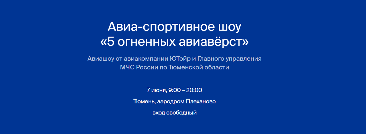 ⚡️ Уже в субботу — 7 июня на тюменском аэродроме «Плеханово» состоится грандиозное авиа-спортивное мероприятие от «ЮТэйр» и Главного управления МЧС России по Тюменской области, которое будет занесено в Книгу рекордов России!