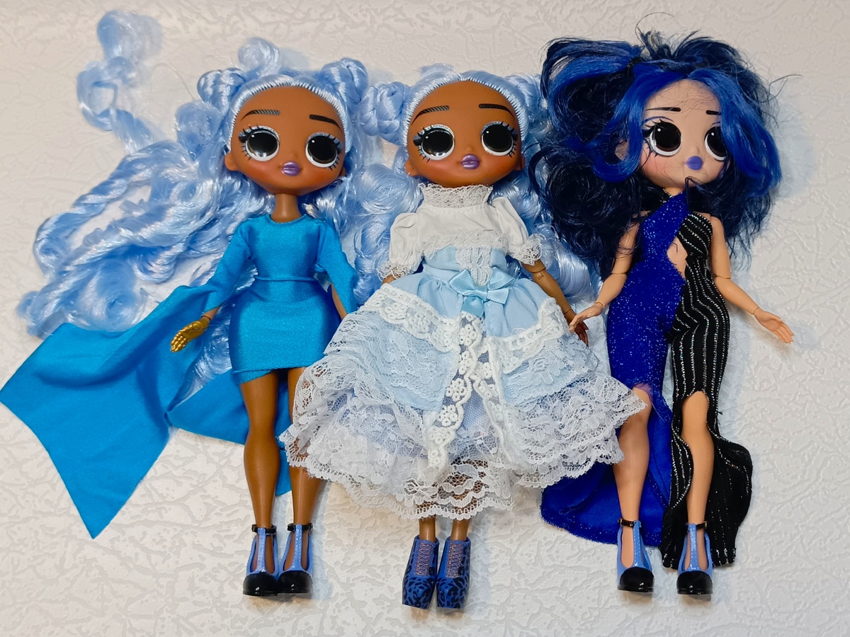 Попалось мне объявление на ОЗОН, где сразу три куколки ЛОЛ «старшая сестра» стоили что-то в районе полутора тысяч рублей. Хотя они мне и не особо нужны, но было просто интересно, что же все-таки пришлют за такие деньги. Кукол в этом объявлении выбрать нельзя, присылают случайный сет. Ко мне приехали вот такие девочки. Две близняшки с голубыми волосами, которые отличаются только нарядами + у одной кисть — протез или что-то в этом роде. И еще одна куколка с темными волосами в состоянии "вечеринка затянулась". Руки у этих кукол шарнирные. Шарниры так себе, если честно — подогнаны не очень хорошо, а у одной вообще болтается и в локет рука не держится. Голова наклоняется и поворачивается, ноги сгибаются на один щелчок. Рисовка на удивление приличная: довольно ровная, без сколов, подтеков и непрокрасов. Единственное, у темноволосой куколки на лице синеватые разводы. Похоже синие пряди слиняли. Они как раз были к лицу прижаты, когда распаковала. Прически залачены были сильно и прошивка та