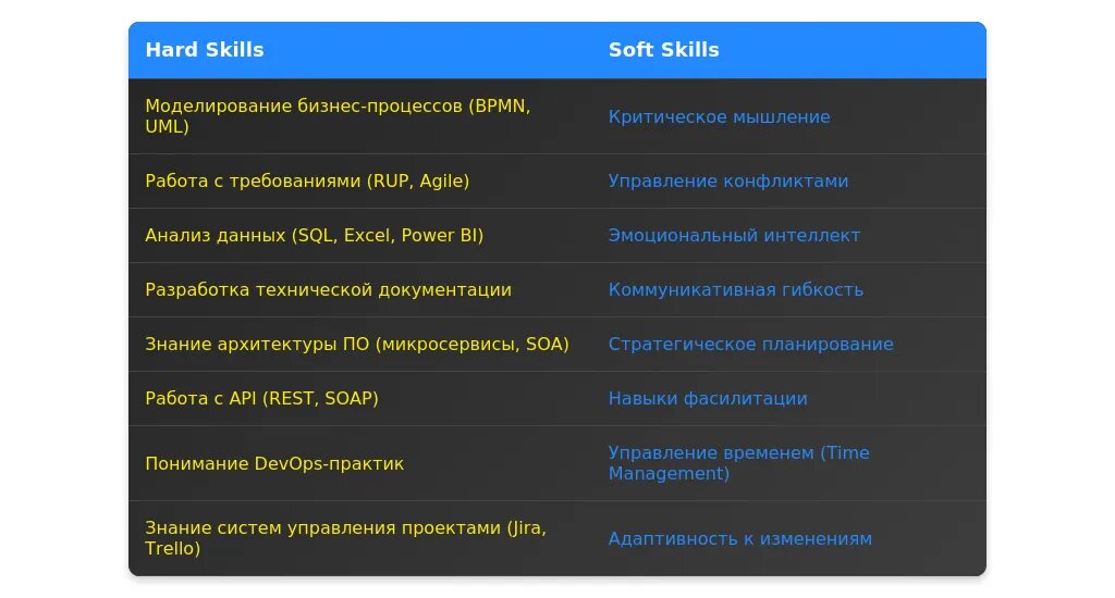 После адаптации: "Навыки эффективной коммуникации с заказчиками и командой разработки, опыт проведения рабочих групп и сбора требований."