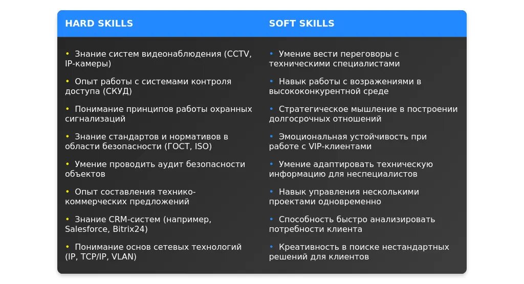 После адаптации: "Опыт работы с CRM, знание систем безопасности, умение анализировать рынок и вести переговоры."