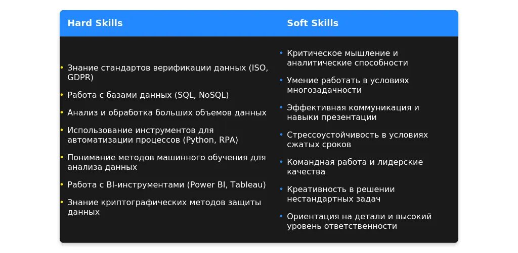 На что делать акцент: аналитические способности, внимание к деталям, навыки работы с документами, знание основ верификации.