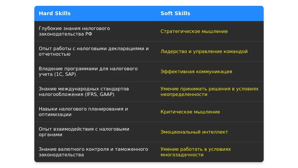 Пример 3: Адаптация навыков: "Знание налогового законодательства" → "Эксперт в области налогового законодательства, успешный опыт минимизации налоговых рисков".