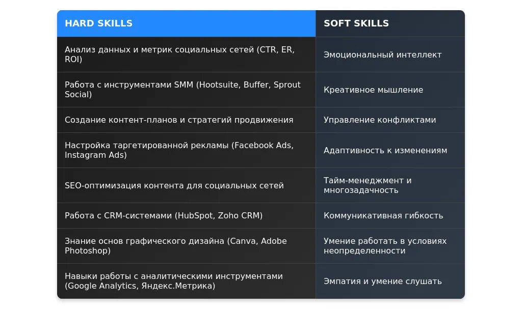 Адаптивность: быстро освоил новые инструменты для работы с социальными сетями.