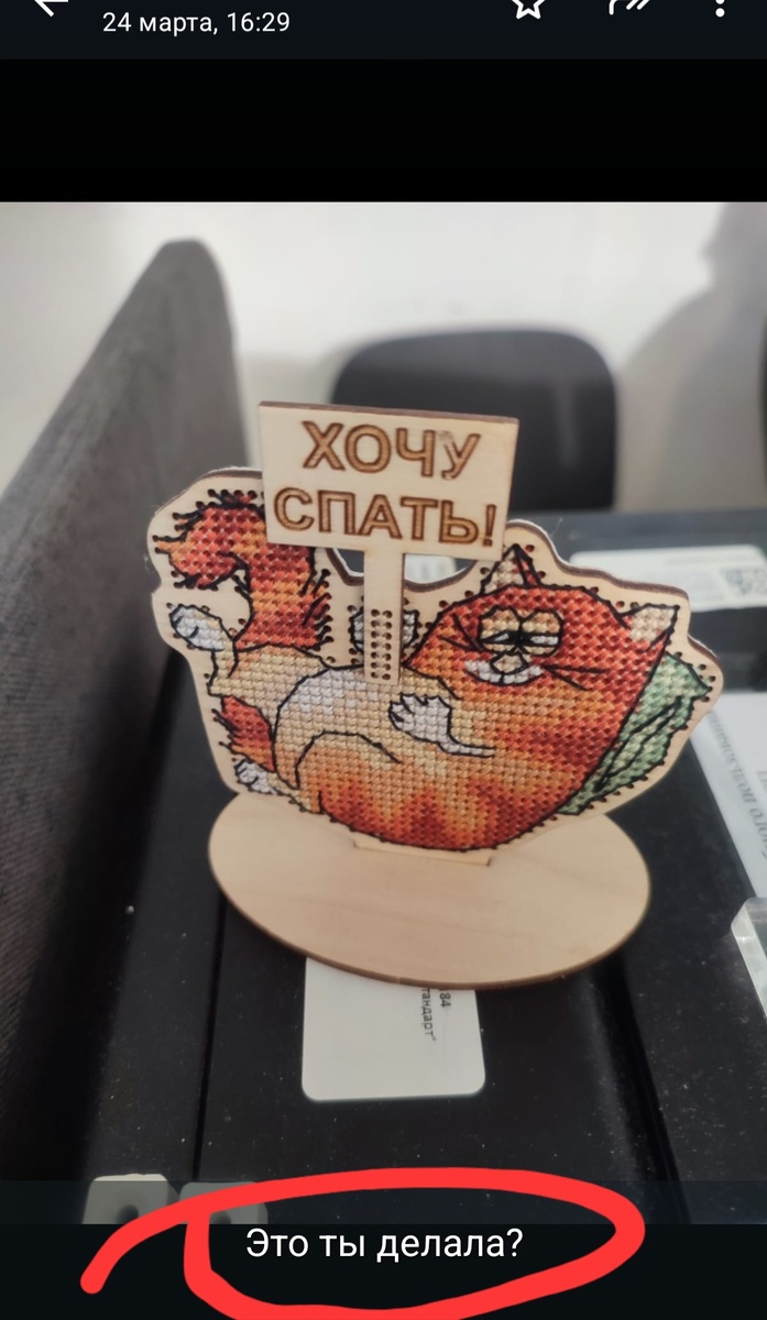 Так хочется побольше отчётов показывать, ведь больше отчётов=больше результат в вышивке. Но... последнее время я меньше вышиваю, больше сплю. Ужас. Хотя, эта статья тоже отчет, и очень даже приятный. Но сначала история. Садитесь детки, я расскажу вам сказку... Тьфу. Унесло, простите 😆 Пару лет назад я перевелась из своего отдела, где проработала 7 лет в другое подразделение и решила некоторым коллегам оставить о себе память. Выбор пал на деревянные игрушки с табличками. Вышила, подарила, при чем, многим заочно. Реакции не видела, думала, ну не понравится, выкинут или спрячут в дальний ящик. И тут, в конце марта, пишет мне коллега-друг: Божечки-кошечки!! 2,5 года этот котик стоит у коллеги на столе!!! Нет, вы только представьте! На столе! На видном месте! Представляете мой восторг? Мою гордость?🤩 Успокоившись, после танца аборигена "ураямолодец", я узнала, что коллега (это, кстати, не владелец котика) хочет второго кота, но который свернулся клубочком и спит. Задачка, однако 🤔