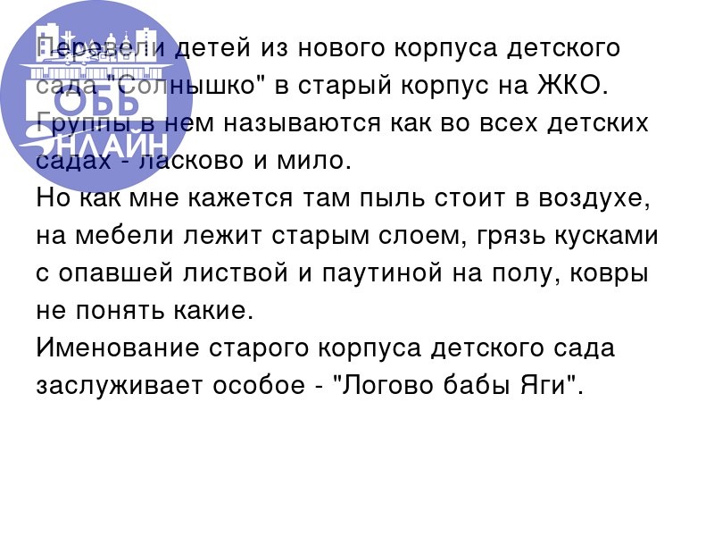 ↗ Перевели детей из нового корпуса детского сада "Солнышко" в старый корпус на ЖКО. Группы в нем называются как во всех детских садах - ласково и мило. Но как мне кажется там пыль стоит в воздухе, на мебели лежит старым слоем, грязь кусками с опавшей листвой и паутиной на полу, ковры не понять какие. Именование старого корпуса детского сада заслуживает особое - "Логово бабы Яги". vk.com Подробнее на https://vk.com/ob.gorod #городобь #городобьонлайн #толмачево