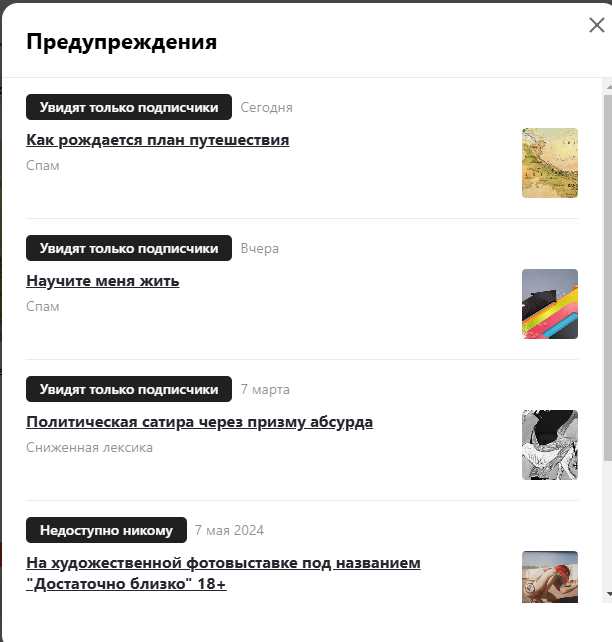 Мои претензии касаются ограничения статей - каждую новую статью алгоритм относит в Спам. Мне каждый раз пишут в ответ, что это ошибочно, что технические службы работают над улучшением работы системы, всегда сердечно извиняются, но мне-то от этих отписок не холодно не жарко. Я уже не знаю, что делать и к кому обращаться.
