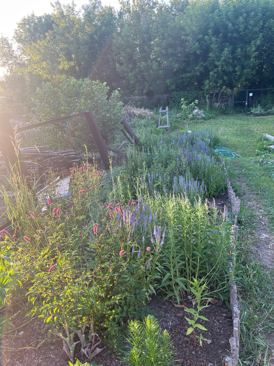 Моему первому в жизни цветнику год. В прошлом году я завершила посадки в конце мая и все лето наблюдала как он развивается. К концу прошлого лета он мне очень нравился. Посадка была сразу довольно плотная, структура цветов разная, цветовая гамма подобрана как мне нравится в розово-сиреневых тонах. Даже больше в сиренево-розовых. Ближе к осени были еще добавлены жители, а также высажены первоцветы: тюльпаны и нарциссы. И вот с середины апреля началось первое цветение, и меня прям все радовало. Одни сорта тюльпанов сменялись другими до середины мая, вокруг них подрастала свежая зелень многолетников. Мне очень нравился этот просыпающийся цветник! А потом, после недели дождей, я приехала и обалдела от появившихся зарослей. Прошлогодняя плотная посадка дала о себе знать. Получился не цветник, а какое-то месиво непонятное. Вероника, заявленная продавцом семян, как компактное растение до 30 см, вымахала не меньше чем на полметра. А она у меня здесь основной цветок. Шалфей с цветоносами во