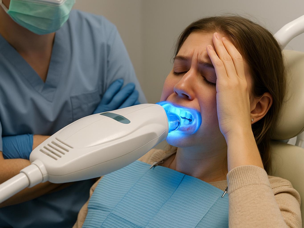 Процедура офисного отбеливания подразумевает использование высококонцентрированных гелей (чаще всего на основе пероксида водорода), которые активируются светом. Это помогает быстро осветлить зубы, но временно снижает защитные свойства эмали. Результат — обнажение дентинных канальцев и гиперчувствительность, особенно у людей с тонкой эмалью, микротрещинами, эрозиями, реставрациями.