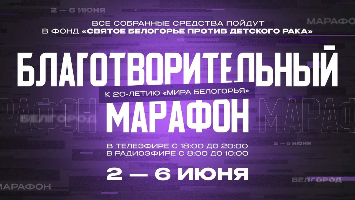 Сегодня стартует благотворительный марафон к 20-летию «Мира Белогорья» Все собранные в его ходе средства пойдут в фонд «Святое Белогорье против детского рака». «Хочу поздравить руководство и коллектив, с которым мы тесно сотрудничаем и вместе сделали уже немало, и поблагодарить их за это начинание. За желание сделать свой праздник – марафоном помощи тем, кому она особенно нужна. Если вы хотите помочь нам, фонду , присоединяйтесь», – обратилась к белгородцам руководитель фонда Евгения Кондратюк. Все подробности – на баннере. #МирБелогорья_20лет Подписаться на нас|Предложить новость