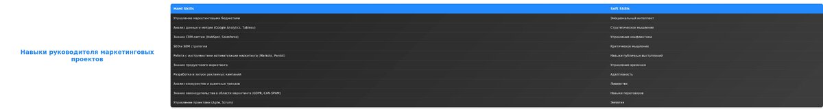 - Ключевые навыки: управление командой, бюджетирование, аналитика.