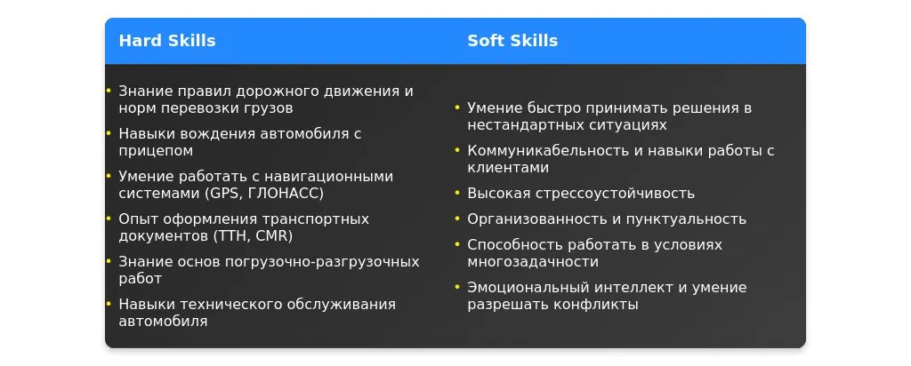 Подтвердите наличие soft skills примерами из опыта работы. Например, "Обеспечил своевременную доставку груза в сложных погодных условиях благодаря дисциплинированности и внимательности".