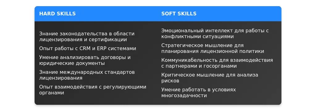 После адаптации: "Опыт работы с программным обеспечением для лицензирования, навыки ведения переговоров, знание Excel."
