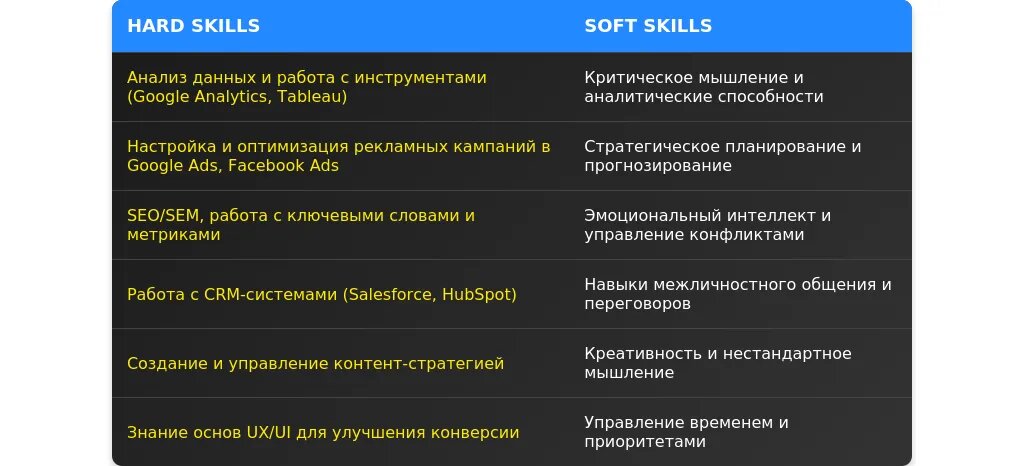 - Навыки для акцента: Базовые знания рекламных платформ, аналитика, коммуникация.