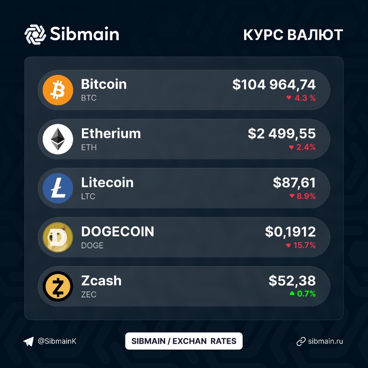 📍 Курс основных криптовалют на 02.06.2025 —————— ➡️ Интересно узнать сколько приносят Ваши майнеры? Для возможности расчета публикуем актуальные курсы криптовалют на сегодня. 💽 Sibmain предоставляет комплексные решения для майнинга под ключ. Вы можете купить, взять в лизинг оборудование для майнинга и разместить их в нашем дата-центре. Sibmain комплексные решения для майнинга под ключ! - Поставки майнинг оборудования - Дата-центр в Красноярске 80 МВт - Размещение от 5 руб/кВтч ⌨️ Нужна консультация или помощь в подборе оборудования? Звоните: +7(800)3511470 📍 г. Москва Калужская площадь д.1 к.1 💬 WhatsApp 💬 @Sibmain_salesbot 🌐 sibmain.ru